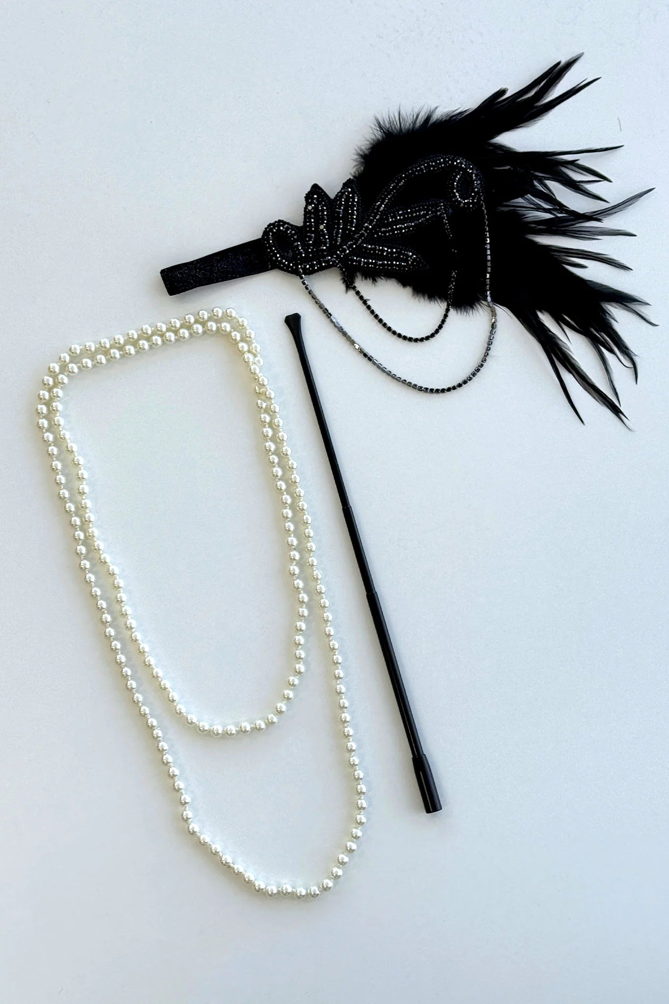Step into the Roaring Twenties with this playful Gatsby's Girl 3 Piece Accessory Kit! It features a chic black headband adorned with feathers and sparkling rhinestones, a long double-layered pearl necklace, and a classic cigarette holder to perfect your flapper look. Pair it with the Gatsby's Girl 2 Piece Set to create a full, dazzling costume that captures the spirit of the Gatsby era in style!