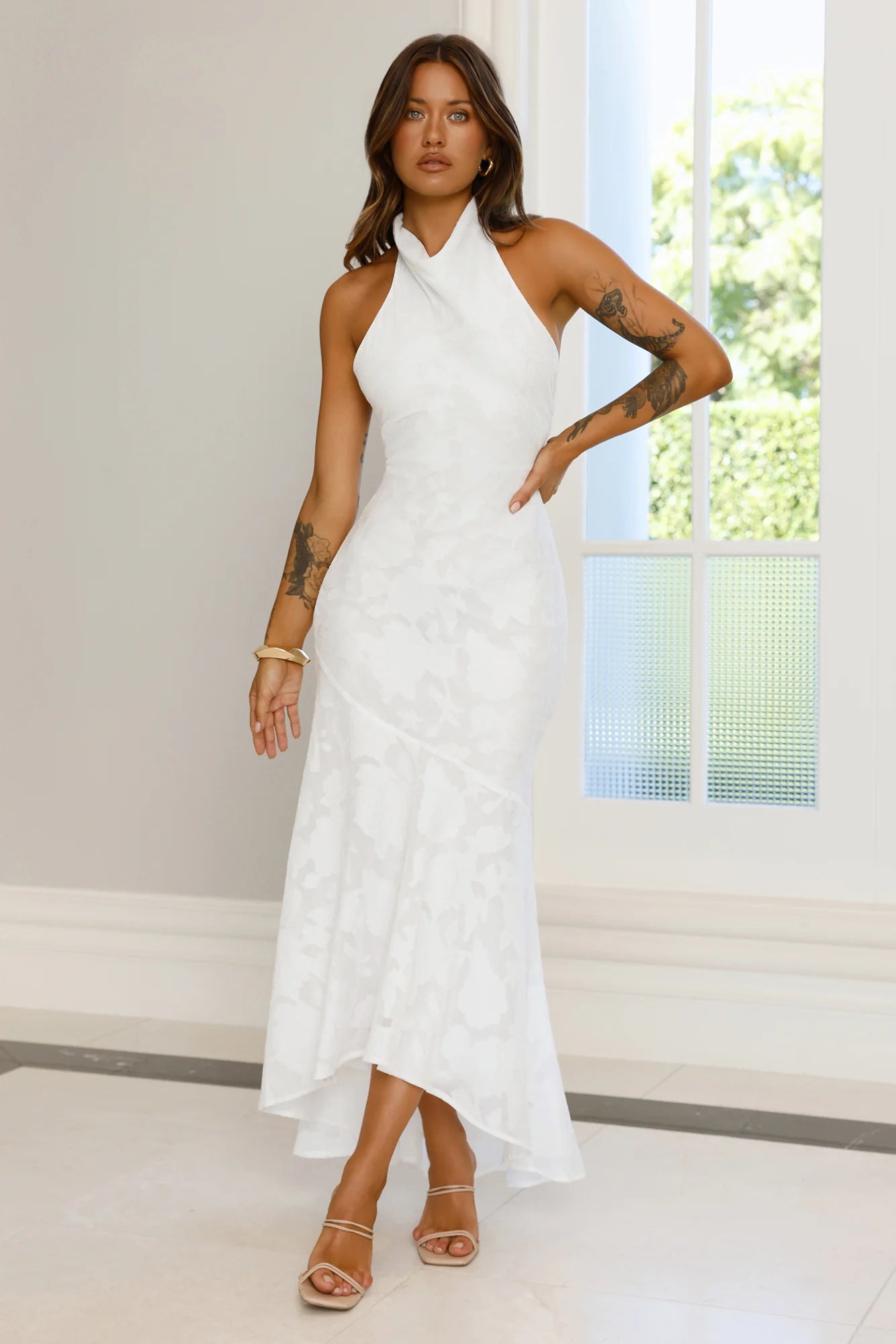 Meet your new fave: the Hints Of Wildflowers Halter Maxi Dress. Designed in a textured floral print that catches the light just right, this halterneck beauty features a dramatic crisscross back and a flowing high-low skirt that moves with every step. Just add soft waves and gold hoops.
