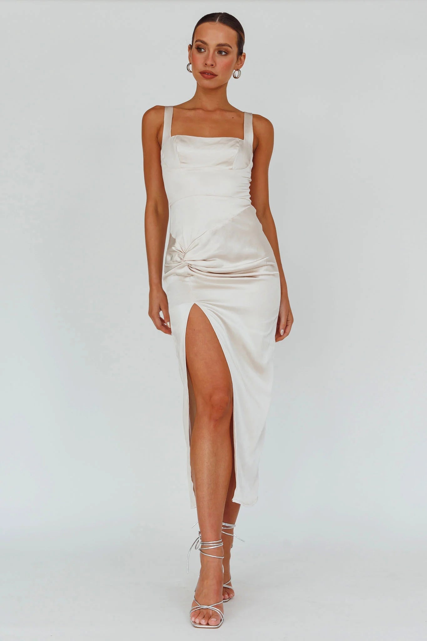 You'll be unforgettable in our gorgeous Kristin midi dress. Featuring a thigh-high split and pretty twist detail in the waist. It's perfect for the modern bride or a special event. Team it with diamante heels and a satin clutch for a look that will leave them speechless.