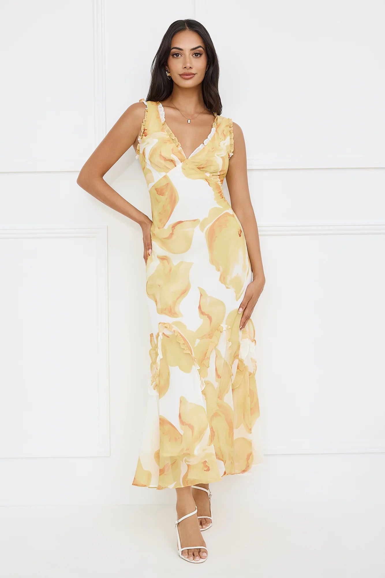 Lovely, we've got your next party dress. The Lemon Meringue Maxi Dress features a frill neckline and a frill skirt with a gorgeous printed silhouette. Style with heels and curls!
