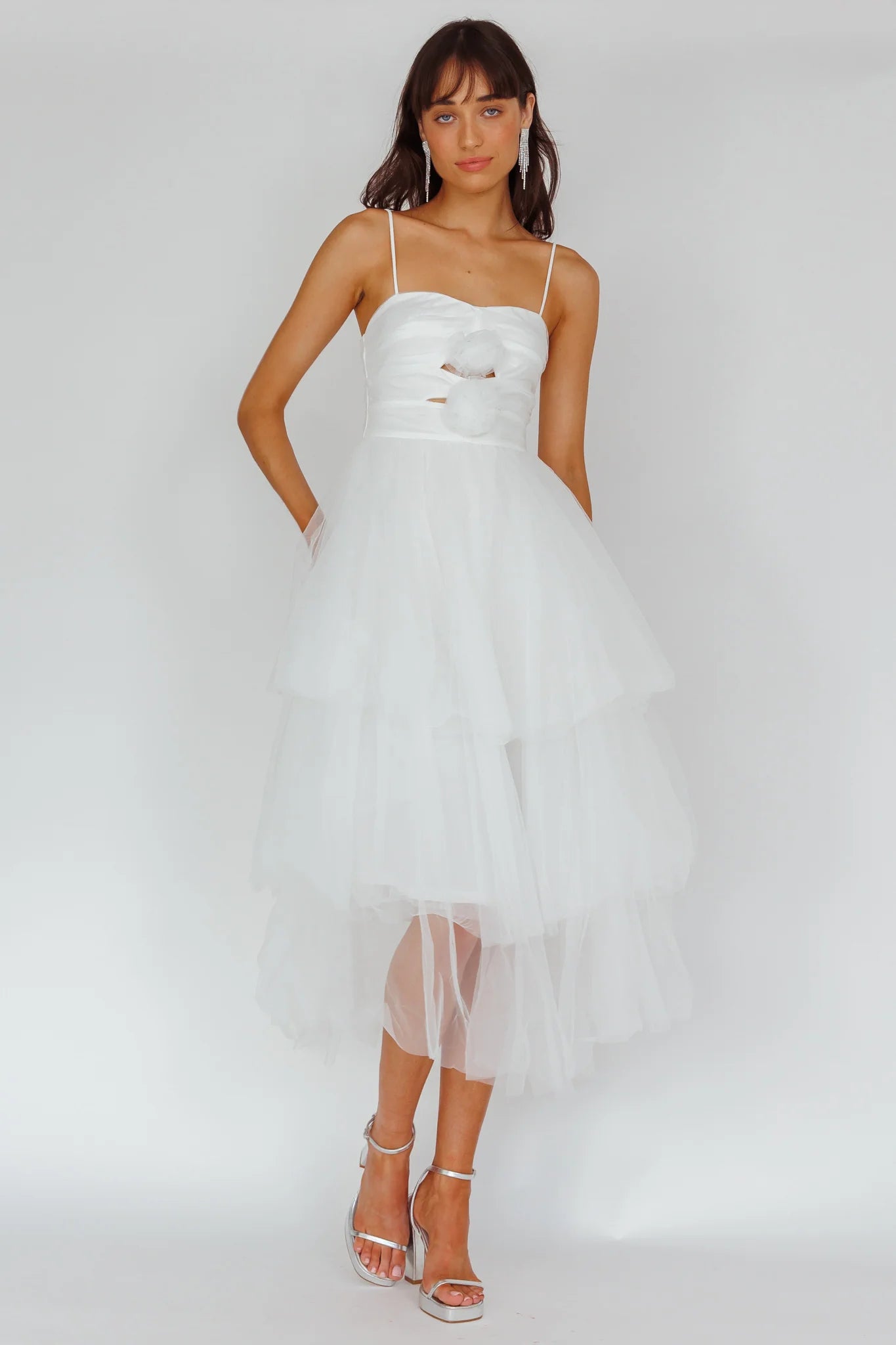 Make your grand entrance in our Seraphina midi dress. We are in love with its layered tulle skirt and rose decoration in the bodice. Perfect for a garden wedding or special birthday celebration. Team it with diamante heels and a satin clutch for a look we are loving.