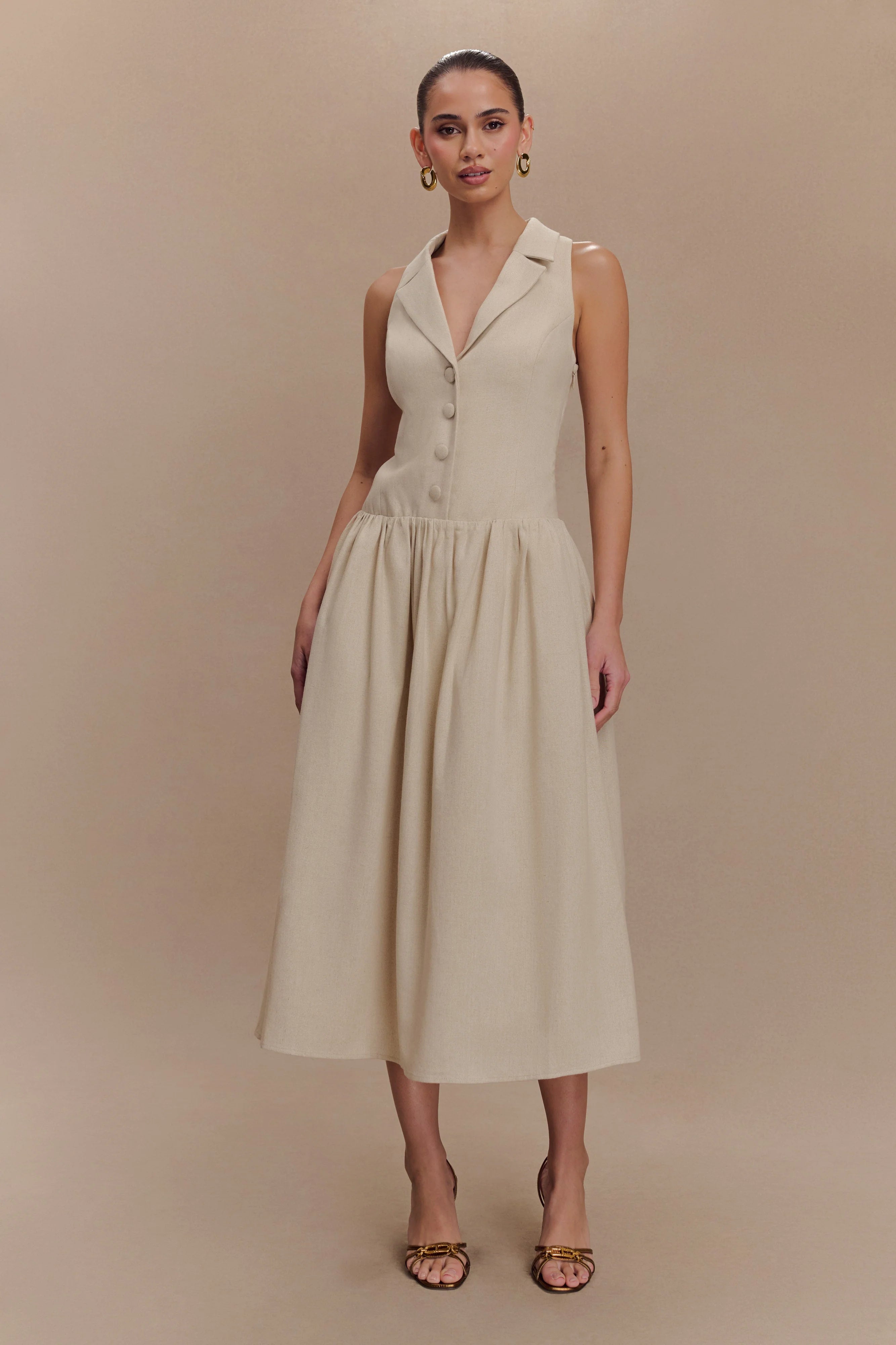 Effortlessly elegant and timelessly chic, the VALERY Linen Midi Collar Dress is a wardrobe must-have for refined style. Featuring a classic collared neckline and a functional centre-front button closure, this sleeveless dress blends sophistication with ease. The fitted bodice accentuates your silhouette, while the drop waist transitions into a full, gathered skirt for a flattering and graceful flow. Designed in a midi length and fully lined for comfort, this dress is perfect for brunches, garden parties, or warm-weather events.